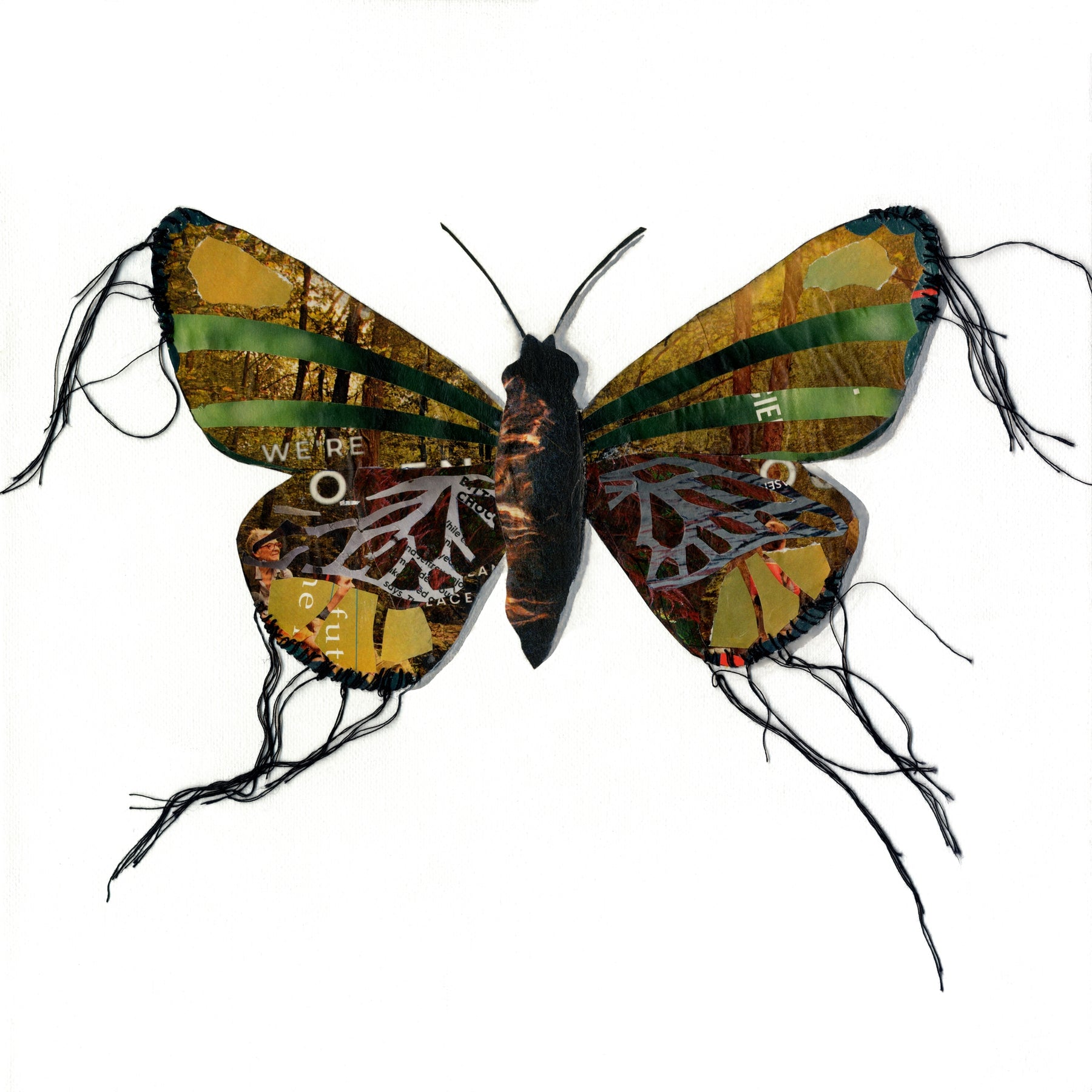 Margaret is a butterfly / moth collage created with recycled magazine bits embellished with delicate hand stitching. Museum-quality wall art.